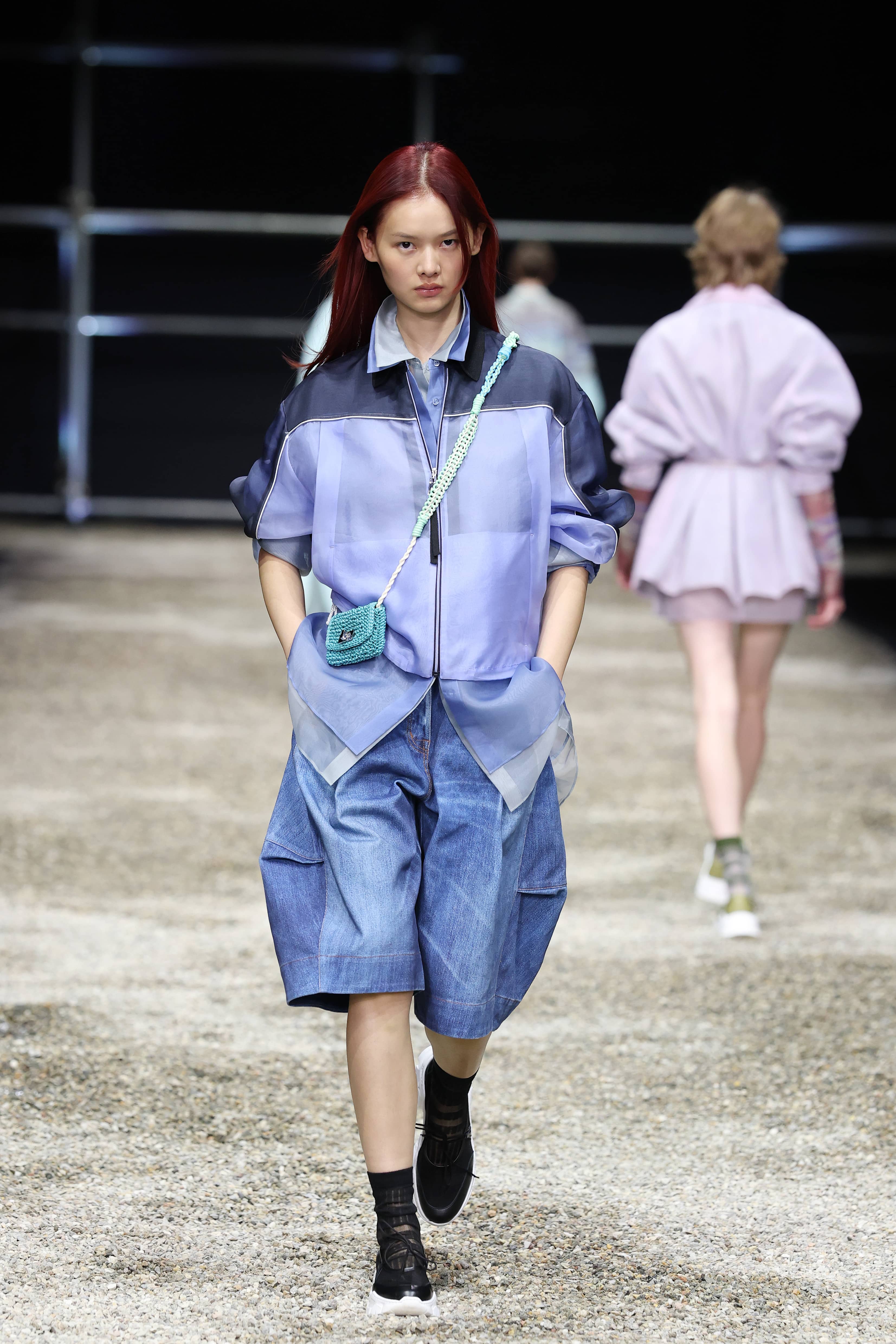 La passerella si fa cantiere poetico: uno stagno riflettente, simbolo di transitorietà e rinnovamento, accompagna capi costruiti con leggerezza e rigore architettonico. Le trasparenze evocano l’arte meditativa di Iwasaki, mentre lo styling a strati ricorda le sue installazioni sospese, in un equilibrio perfetto tra solidità e impalpabilità.