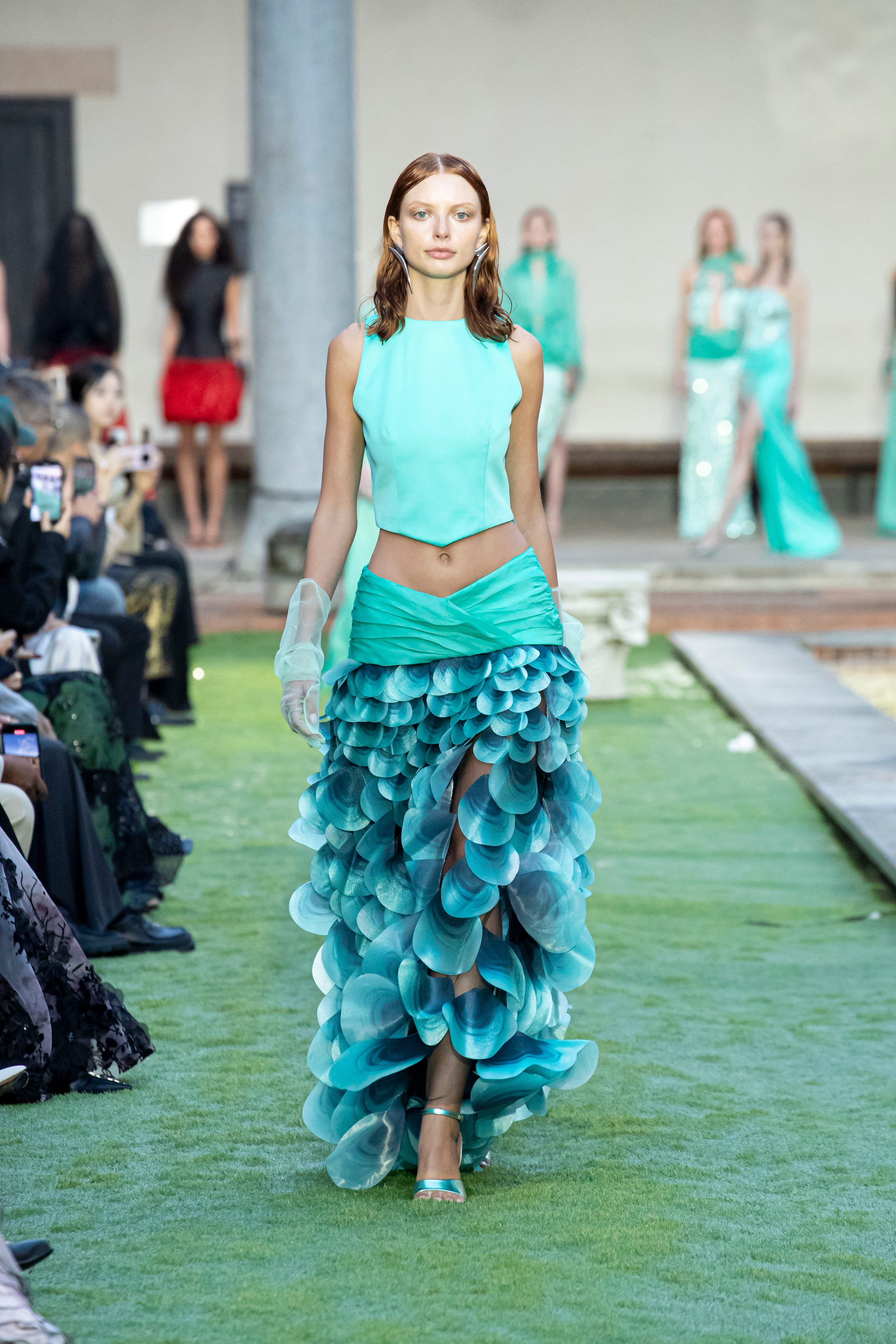La passerella si fa rito contemporaneo, costruito intorno ai quattro elementi primordiali — Terra, Acqua, Fuoco, Aria — con l’aggiunta di un quinto, la Libertà. Quest’ultima non è soltanto concetto, ma esperienza: la possibilità di interpretare e incarnare un’idea personale di emancipazione, che per la designer si lega a una scintilla di “pazzia”, intesa come coraggio creativo e rottura degli schemi.