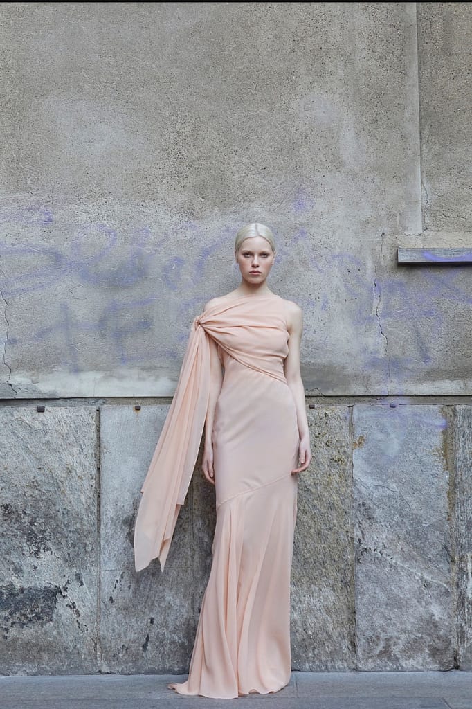 Gli abiti da sera? Veri e propri momenti da Oscar. Profonde scollature, spacchi vertiginosi, tagli asimmetrici che accarezzano il corpo come una pellicola preziosa. Boleri in marabù cipria fluttuano come un sussurro, mentre il tulle, il metallo e gli Swarovski accendono il ritmo di un’eleganza che vibra a ogni passo.