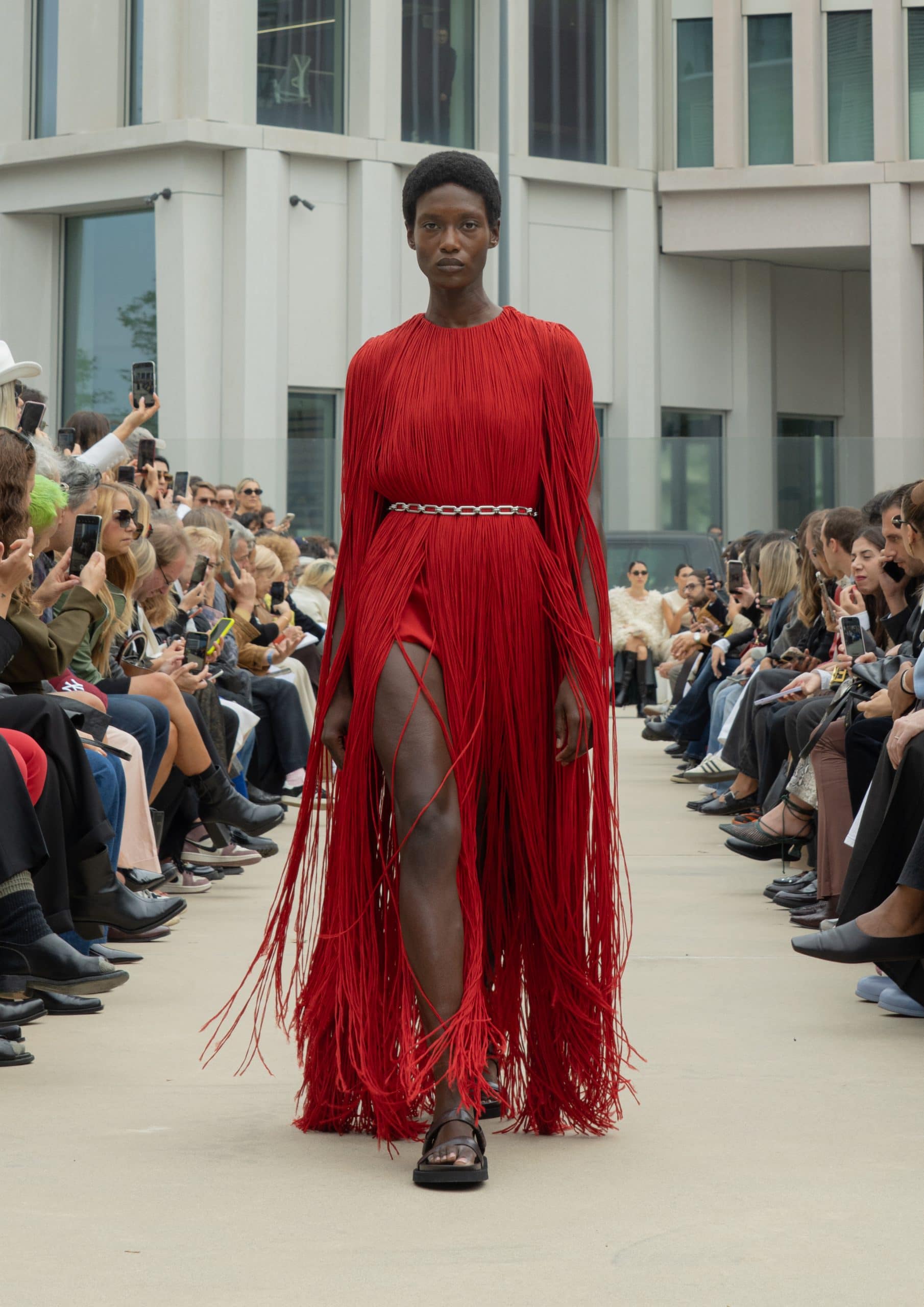 L’elemento naturale attraversa l’intera collezione, in una lettura trasversale di tessuti e colori: sete organzate, cotoni tinti a freddo e fil coupé mimano i movimenti vitali di foglie al vento o i colori di intensi tramonti, come per l’abito rosso sanguigno, reso leggero da una cascata di frange in chiffon di seta intrecciato a mano che diventa uno dei motivi ricorrenti della stagione.