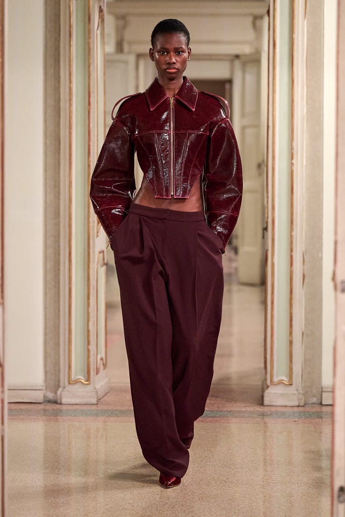 Le silhouette scolpiscono il corpo con linee rigorose, esaltando spalle e punto vita, mentre il dialogo tra texture e materiali—lucidi e statuari, opachi e voluttuosi—crea un magnetismo irresistibile. Blazer in pelle animal-free stampa cocco e biker jacket strutturate definiscono la figura, accostandosi a gonne midi sensuali e maglie aderenti. I cappotti sartoriali celano abiti in jersey con cut-out audaci, mentre la pelliccia sintetica si sovrappone a un tailoring impeccabile. Vinile e dettagli strutturati sottolineano un’allure iperfemminile.