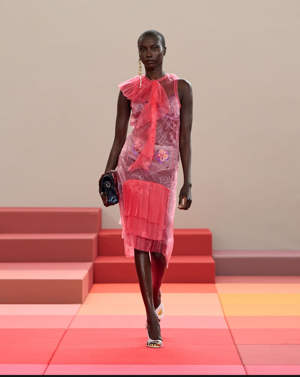 Il romanticismo si accende di sfumature oniriche nei vestiti rosa cipria e fucsia, leggeri come veli. Inserti floreali, scolli trasparenti e tagli obliqui raccontano una femminilità che non teme la vulnerabilità, trasformandola in potenza visiva.