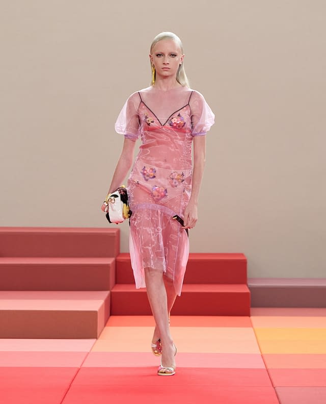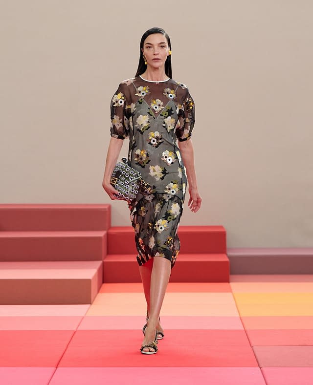 Silvia Venturini Fendi ha intrecciato il rigore artigianale della maison con un’estetica che gioca sulla contaminazione. Il risultato è un guardaroba che oscilla tra forza e trasparenza, struttura e leggerezza, con una palette che sfuma dal rigore geometrico al romanticismo floreale.
