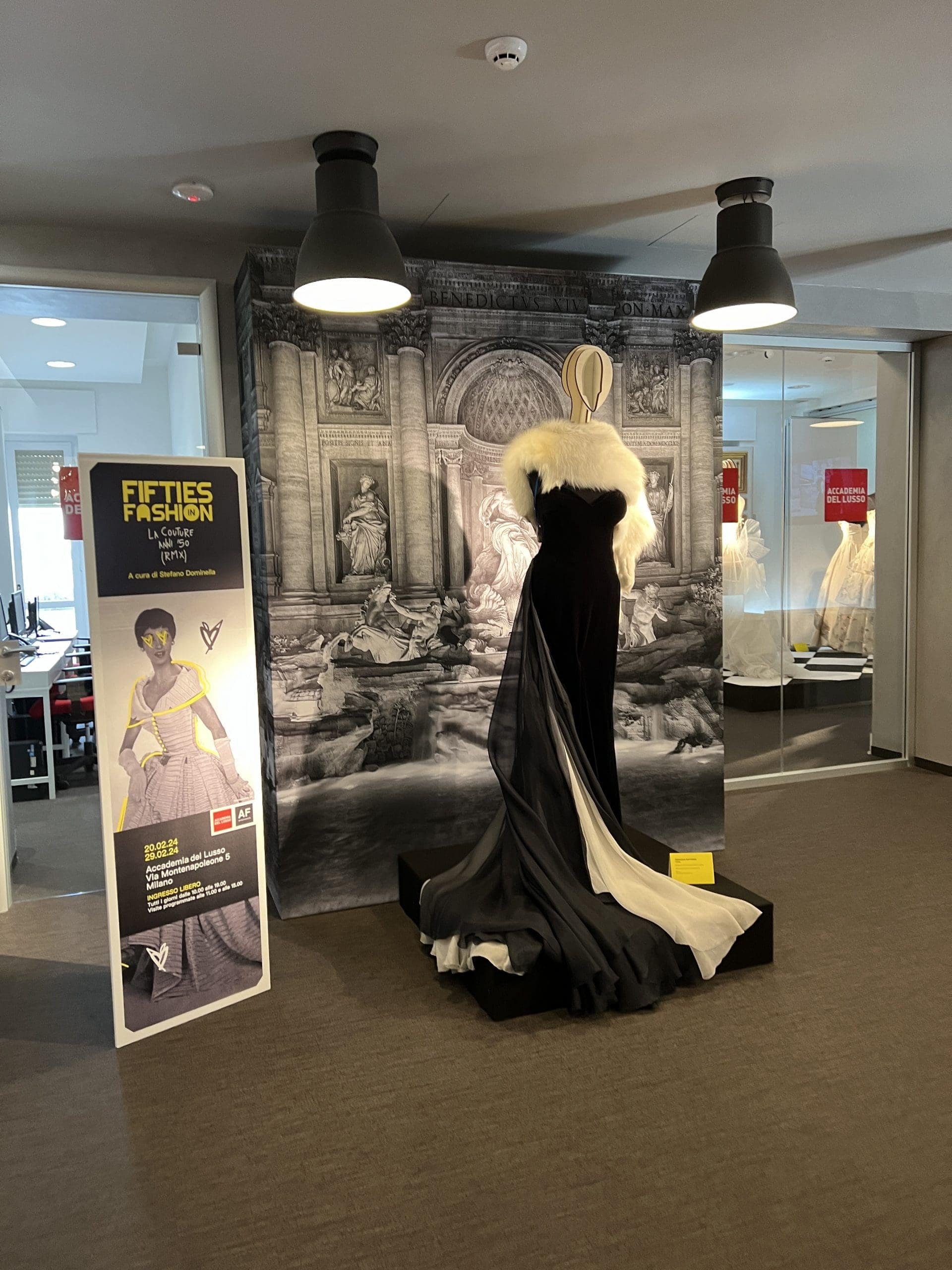 L’abito sirena in velluto nero che indossava la giunonica Anita Ekberg nel film “La Dolce Vita”, di Federico Fellini, durante le riprese della celebre scena nella Fontana di Trevi, accoglie e apre l’esposizione “Fifties in Fashion” all’Accademia del Lusso di Milano (in collaborazione con Afro Fashion Association).