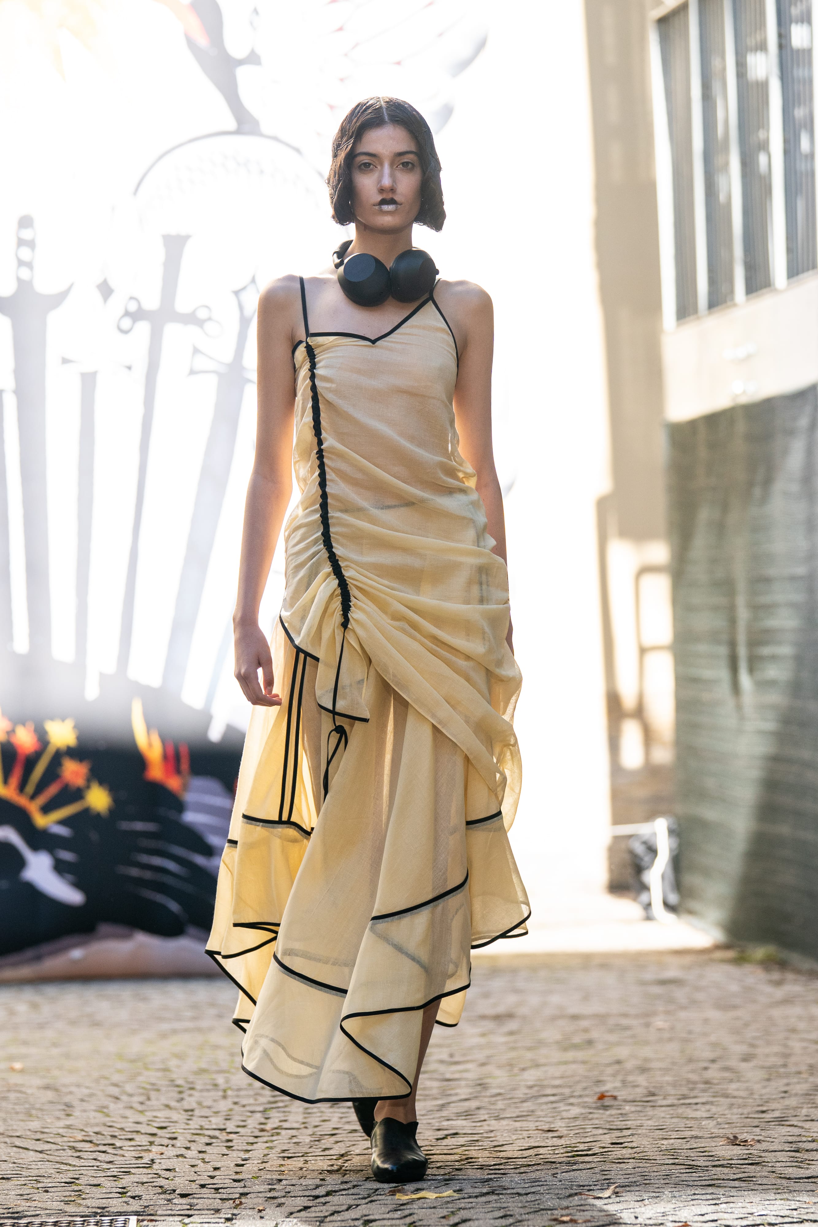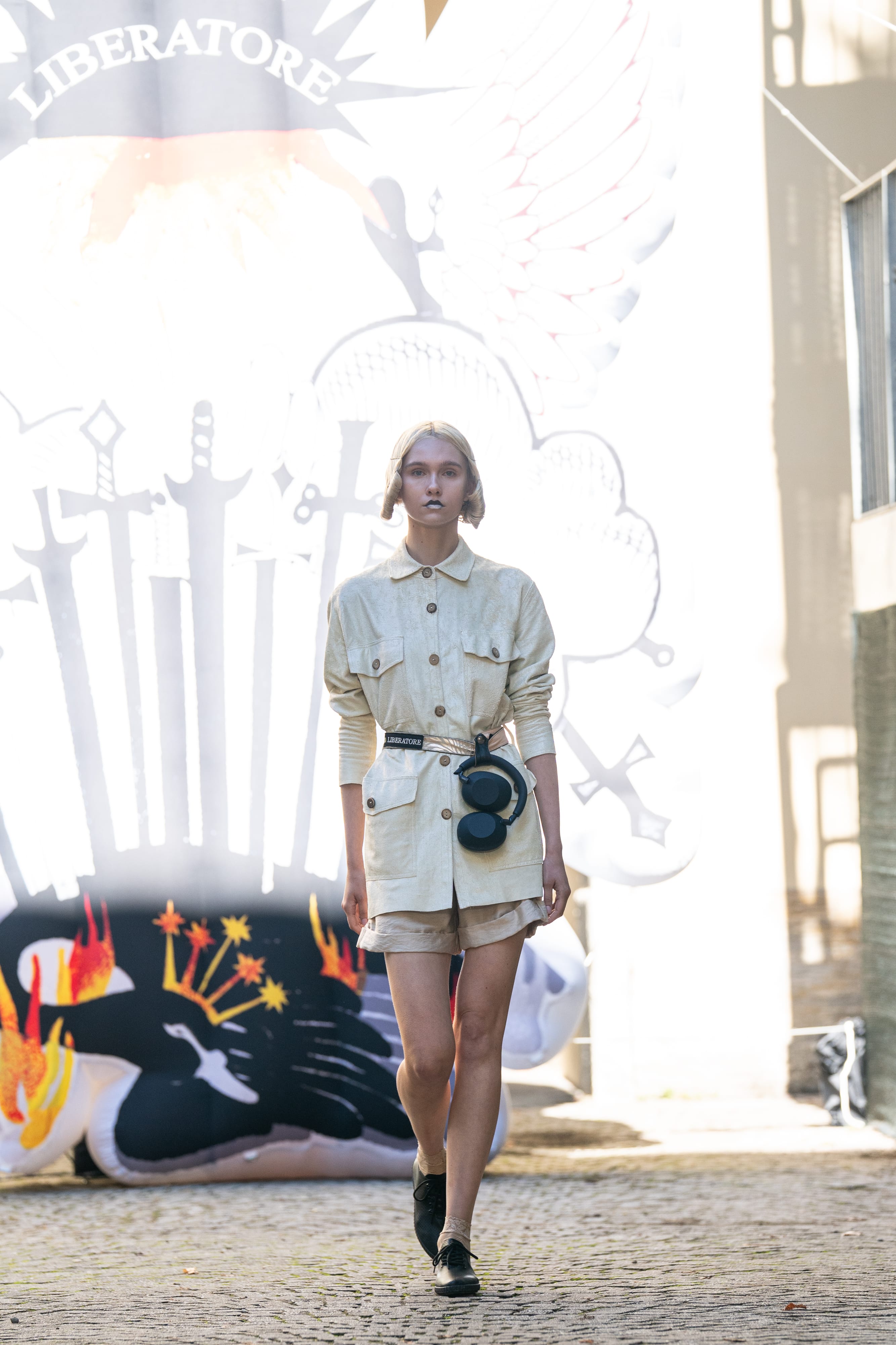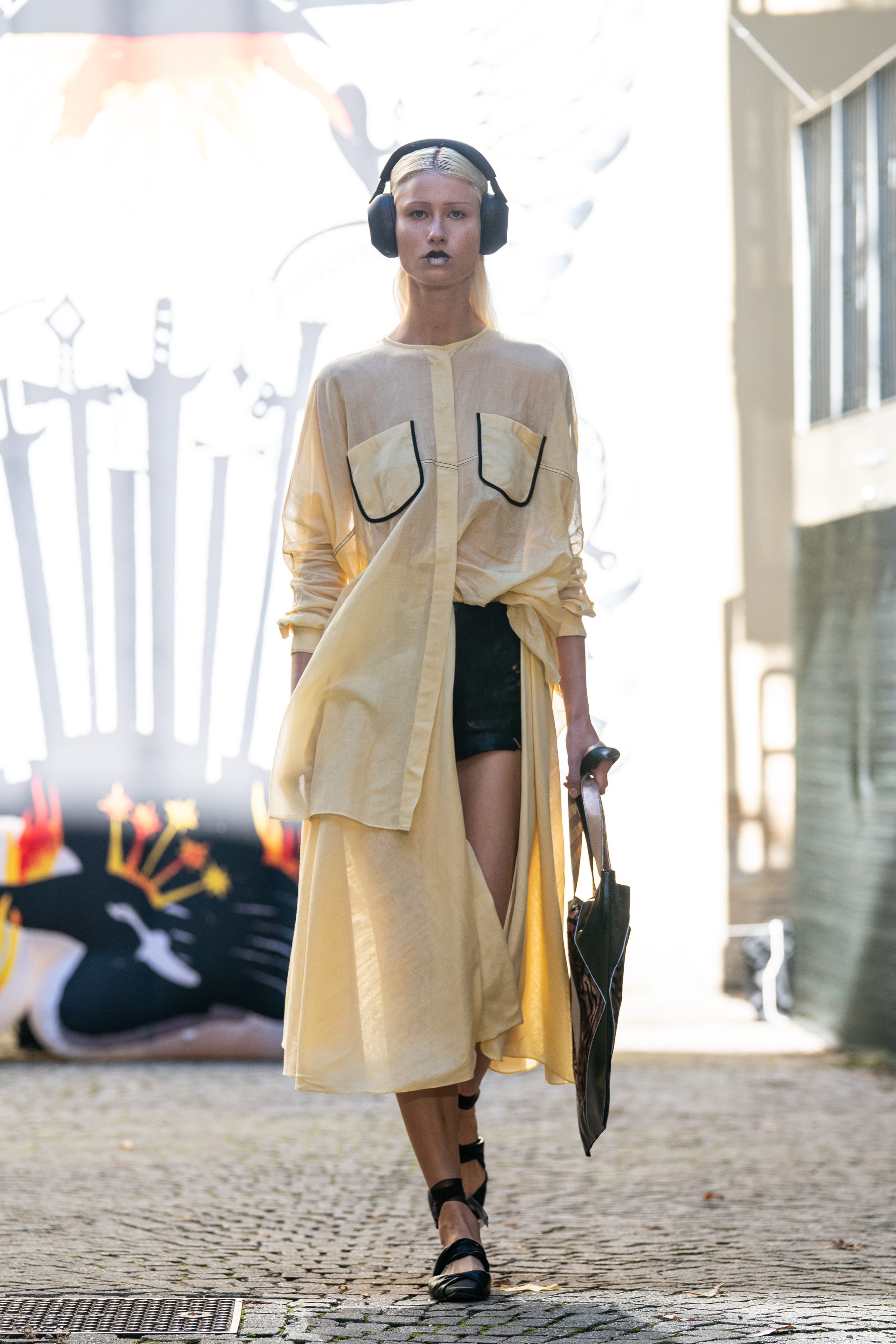 Gli abiti si muovono tra memoria e presente: tessuti recuperati da letti d’epoca, testimoni di una bellezza autentica, si trasformano in giacche e soprabiti avorio, mentre jersey a taglio vivo, voile di cotone, jacquard e stampe floreali perdono volutamente la loro forma originaria per rinascere in camicie over, gonne modulari e outerwear intarsiato. Le schiene si allacciano come cinte che si trasformano in tracolle, tote bag e shopping bag accessoriate di patch logati, concepiti anche come custodie per le cuffie.