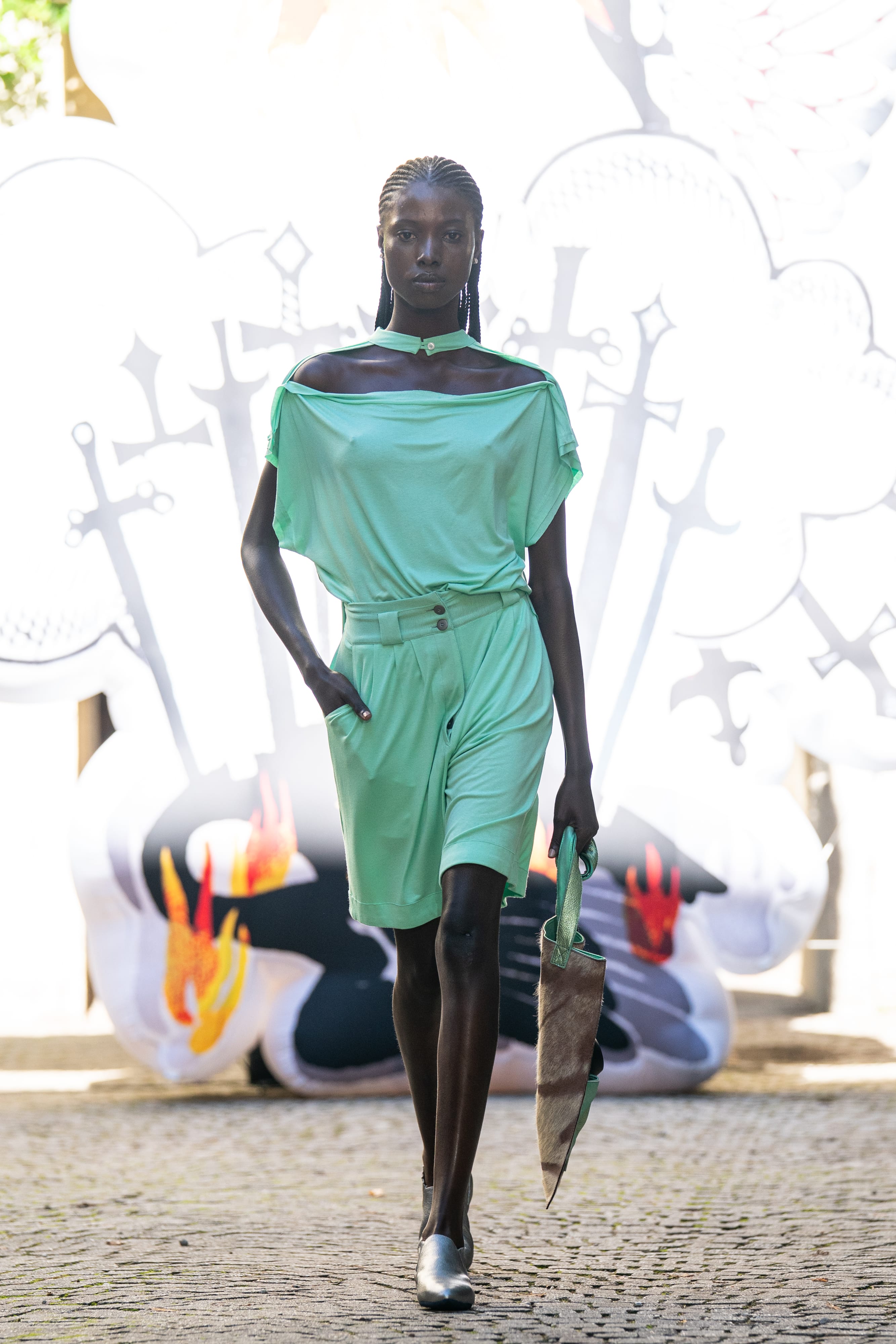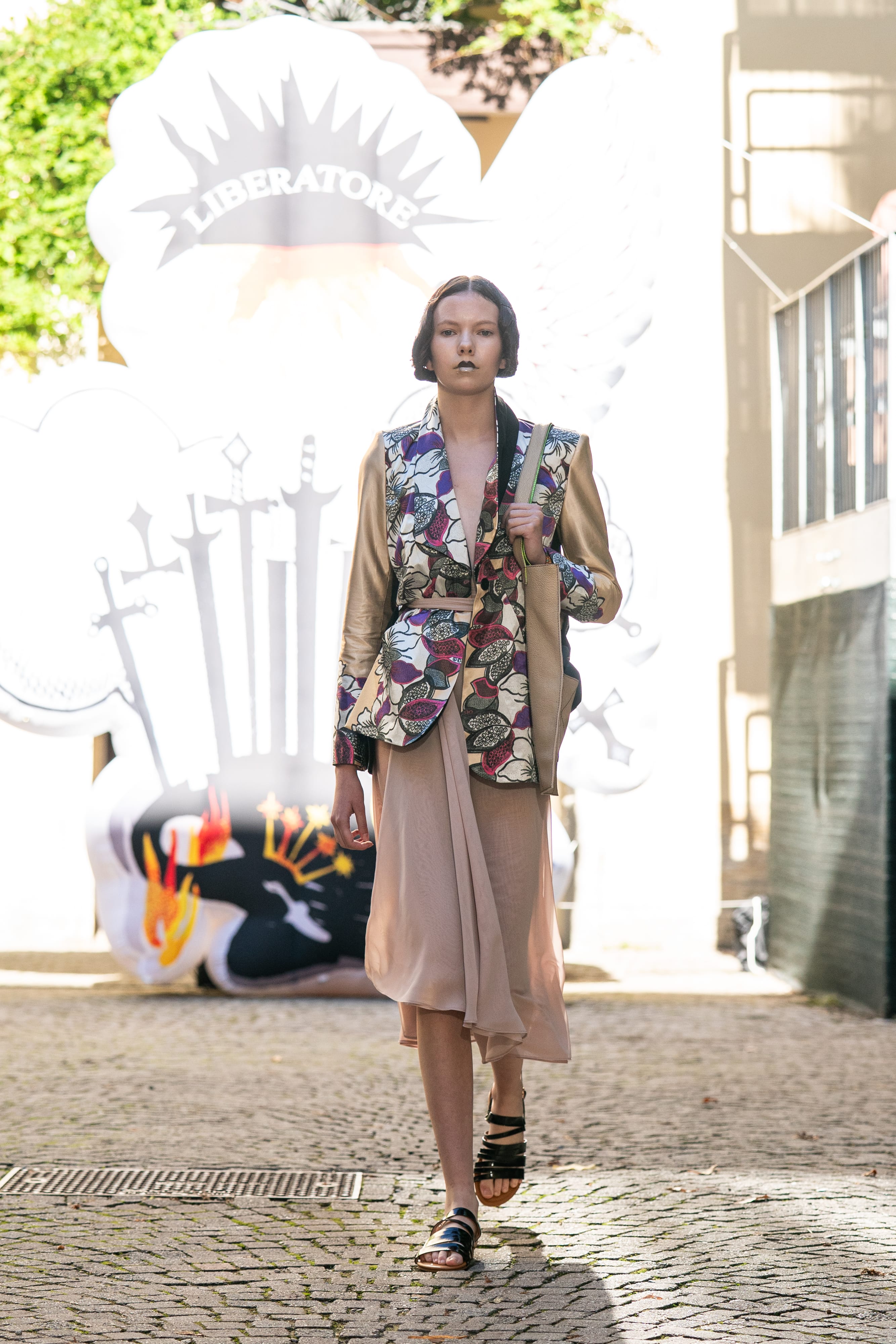 In apertura di show, tre copricapi recano le parole Immaginazione, Possibilità, Pensare: dichiarazioni di intenti che Liberatore trasforma in abiti capaci di dialogare con l’animo umano. Una riflessione sull’oggi, dove la violenza e l’incertezza impongono una pausa necessaria, un invito a riconsiderare le priorità. “Questa stagione siamo stati tutti travolti da accadimenti più grandi della nostra sensibilità creativa. Ho confidato nella persistenza, nella capacità di credere e fare il mio lavoro, ma con la coscienza delle priorità”, racconta la designer.