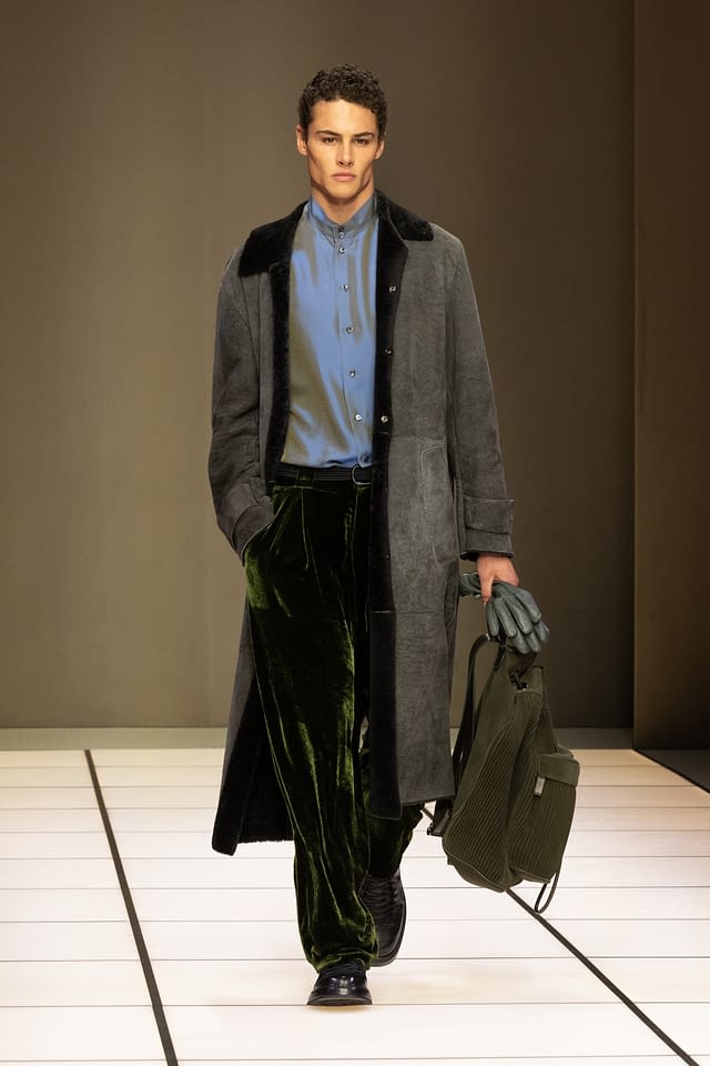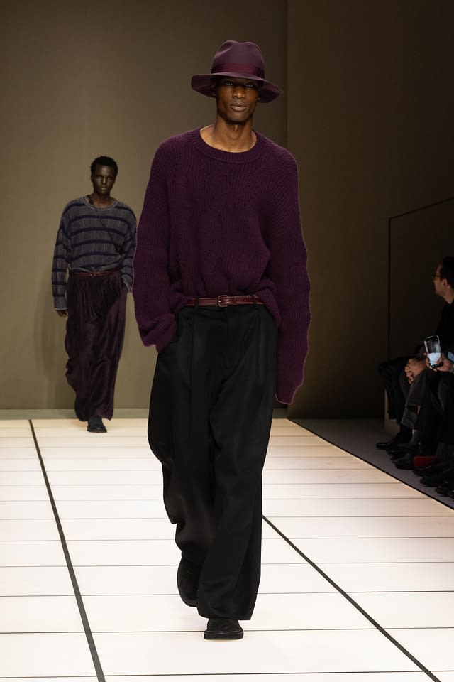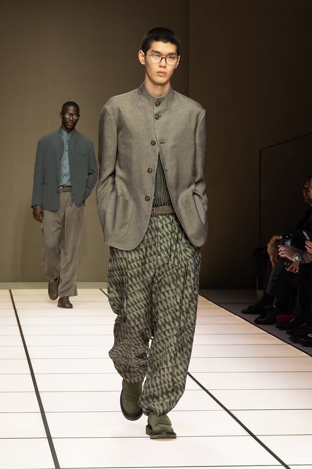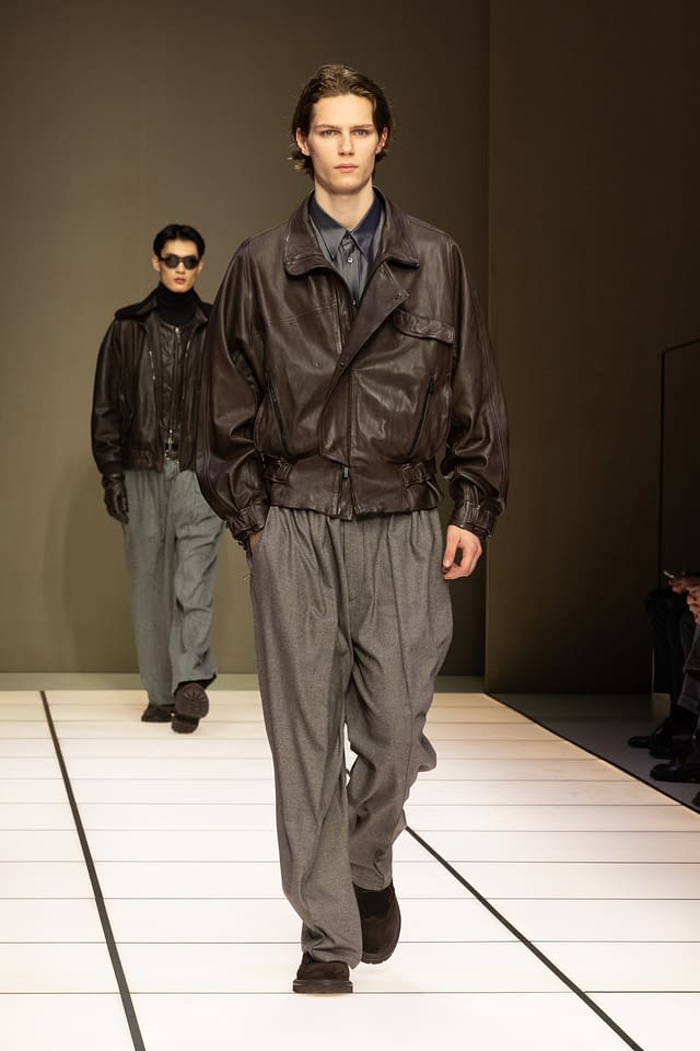 La silhouette riflette questa visione con naturalezza. I volumi sono fluidi, sciolti, pensati per seguire il corpo senza costringerlo. Blouson morbidi, giacche dalle abbottonature basse, cappotti avvolgenti, camicie con o senza collo e pantaloni ampi che ricadono su scarpe in suede o boot. Un guardaroba che privilegia il gesto, il passo, il movimento, secondo l’idea di eleganza disinvolta che Giorgio Armani ha reso un tratto distintivo del suo stile .