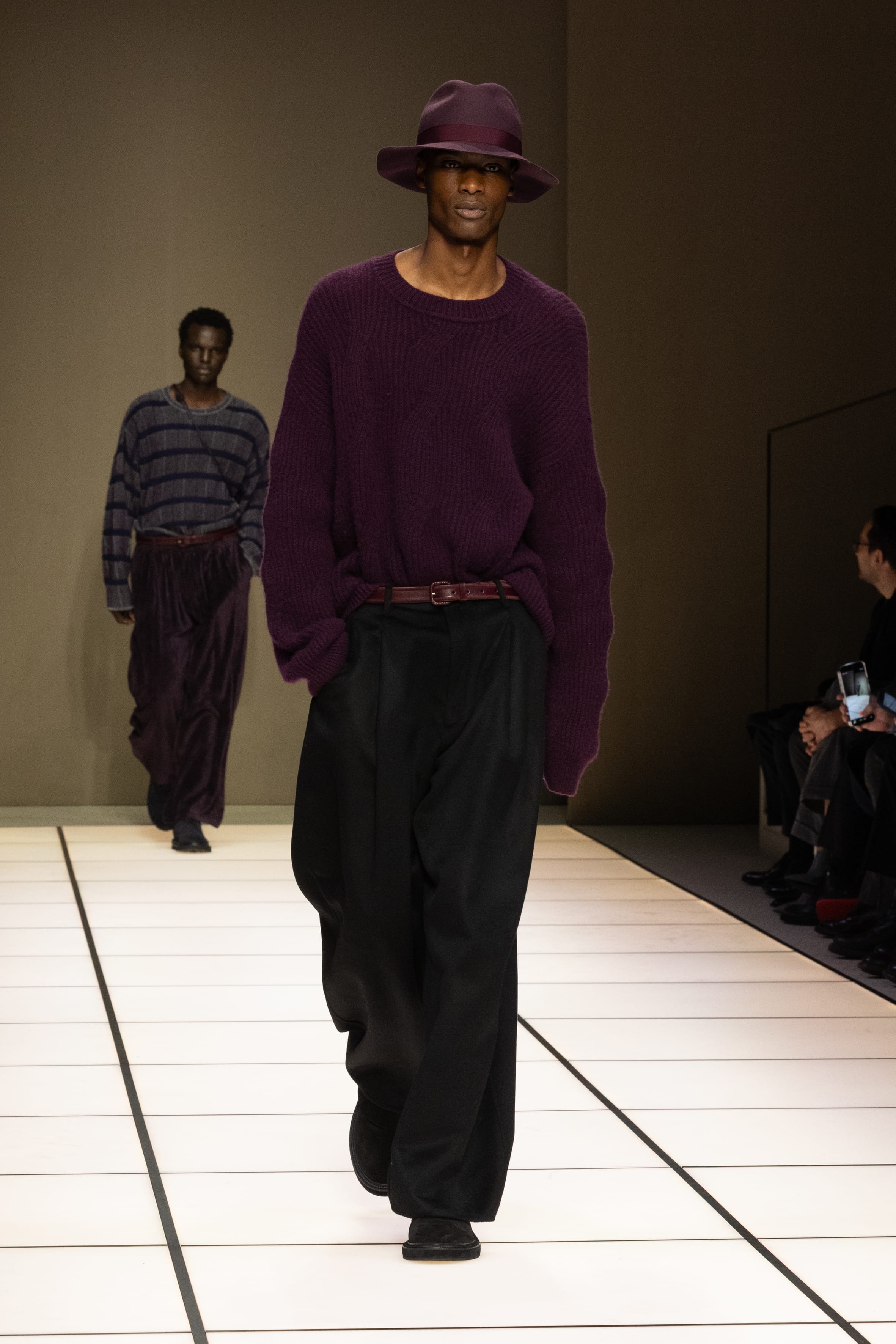 In questa stagione, il racconto passa soprattutto dal colore. Non protagonista assoluto, ma presenza consapevole. Toni di verde oliva, viola ametista e blu lapislazzuli attraversano una palette di grigi, beige, neri e blu profondi. Accenti calibrati, mai invasivi, che emergono grazie a una sapiente ricerca sulle materie: velluti, crêpe, ciniglia e tessuti serici dialogano con cashmere garzati, lane battute e pelli dalla mano opaca e tattile. Superfici che catturano la luce e la restituiscono in modo diverso, creando un continuo gioco di lucido e opaco .