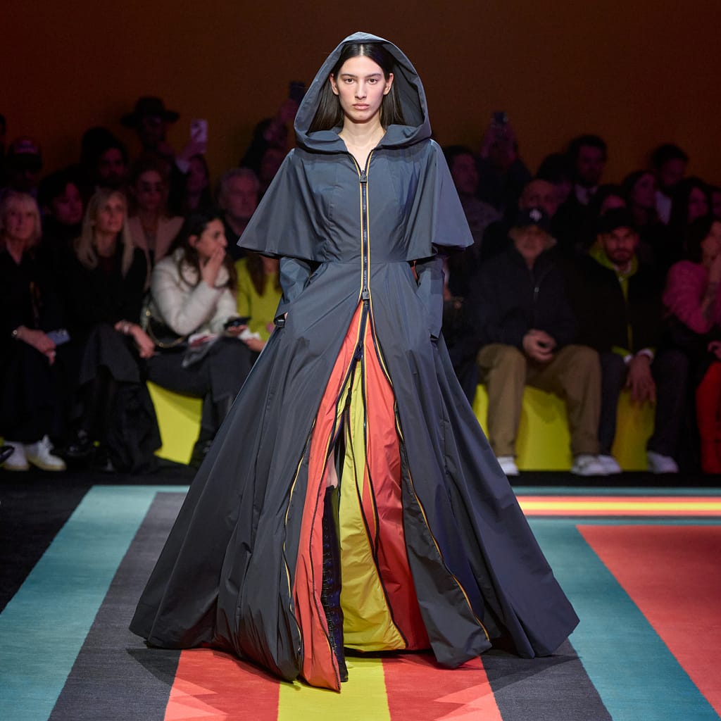 L’heritage cromatico del brand si fa sentire forte in passerella: i toni iconici blu, giallo e arancione incontrano sfumature sofisticate come il burgundy, creando una palette energica e vibrante. La zip tricolore, segno distintivo di K-Way®, attraversa la collezione come un leitmotiv, trasformandosi da semplice dettaglio funzionale a elemento decorativo. La versatilità del brand prende nuova forma anche nei materiali: l’iconico nylon del Le Vrai diventa protagonista di un raffinato gioco di contrasti materici, tra tessuti tecnici e texture inaspettate.