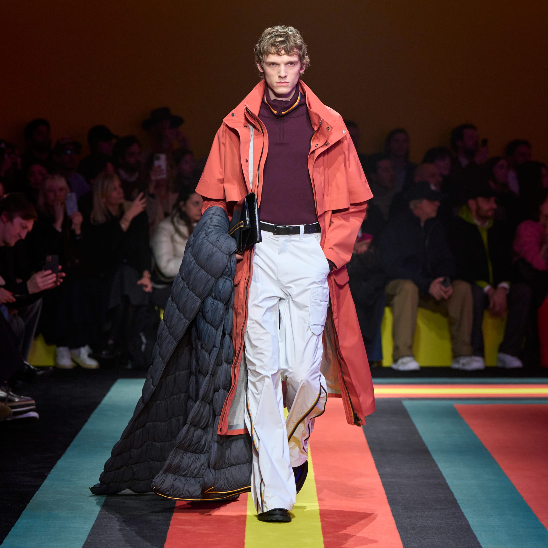 L’heritage cromatico del brand si fa sentire forte in passerella: i toni iconici blu, giallo e arancione incontrano sfumature sofisticate come il burgundy, creando una palette energica e vibrante. La zip tricolore, segno distintivo di K-Way®, attraversa la collezione come un leitmotiv, trasformandosi da semplice dettaglio funzionale a elemento decorativo. La versatilità del brand prende nuova forma anche nei materiali: l’iconico nylon del Le Vrai diventa protagonista di un raffinato gioco di contrasti materici, tra tessuti tecnici e texture inaspettate.