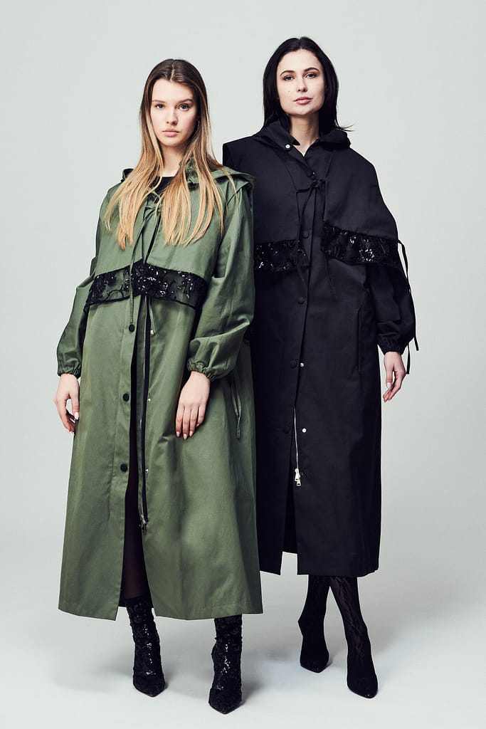 Il fil rouge della collezione è il pizzo di paillettes, elemento distintivo che illumina abiti, bomber, gonne e camicie con giochi di luce e trasparenze raffinate. Le silhouette si alternano tra volumi strutturati e morbide fluidità, con abiti in tulle e pizzo ricamato da sovrapporre a sottovesti in jersey di lana nelle tonalità nude, nero e bordeaux. Le camicie gessate si impreziosiscono di colletti in pizzo lavorato, mentre il trench si reinventa con dettagli scintillanti che ne esaltano l’eleganza. Il bomber, protagonista della stagione, si trasforma in un capo passe-partout grazie a trasparenze in tulle e organza, ricami preziosi e imbottiture innovative, perfetto dal giorno alla sera.