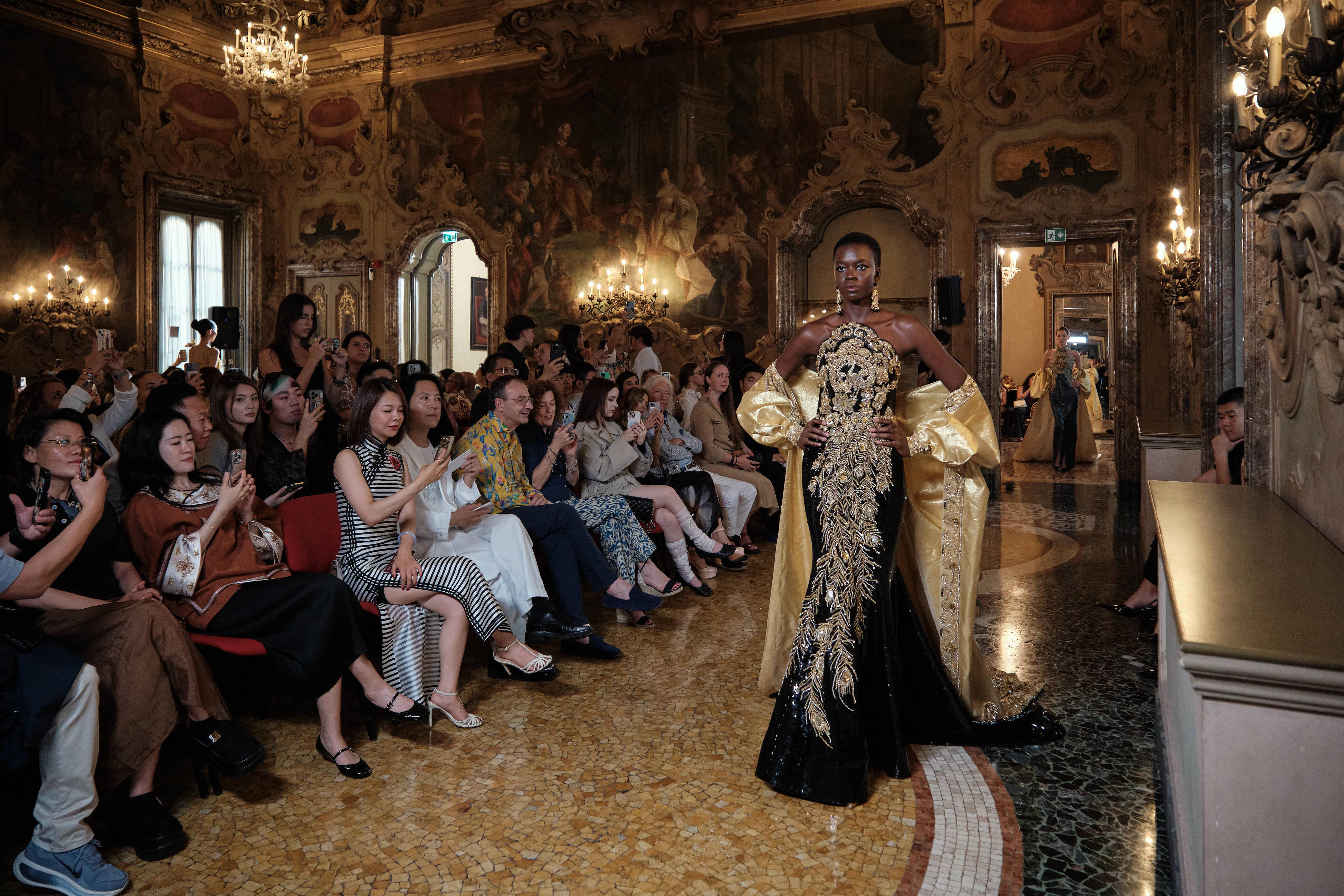 Ogni creazione è un racconto visivo: le linee architettoniche degli antichi palazzi diventano tagli sartoriali netti e strutturati, mentre ricami e tessiture in seta dialogano con materiali innovativi e tecniche moderne. Il risultato è un’eleganza che coniuga rigidità e morbidezza, memoria e avanguardia.