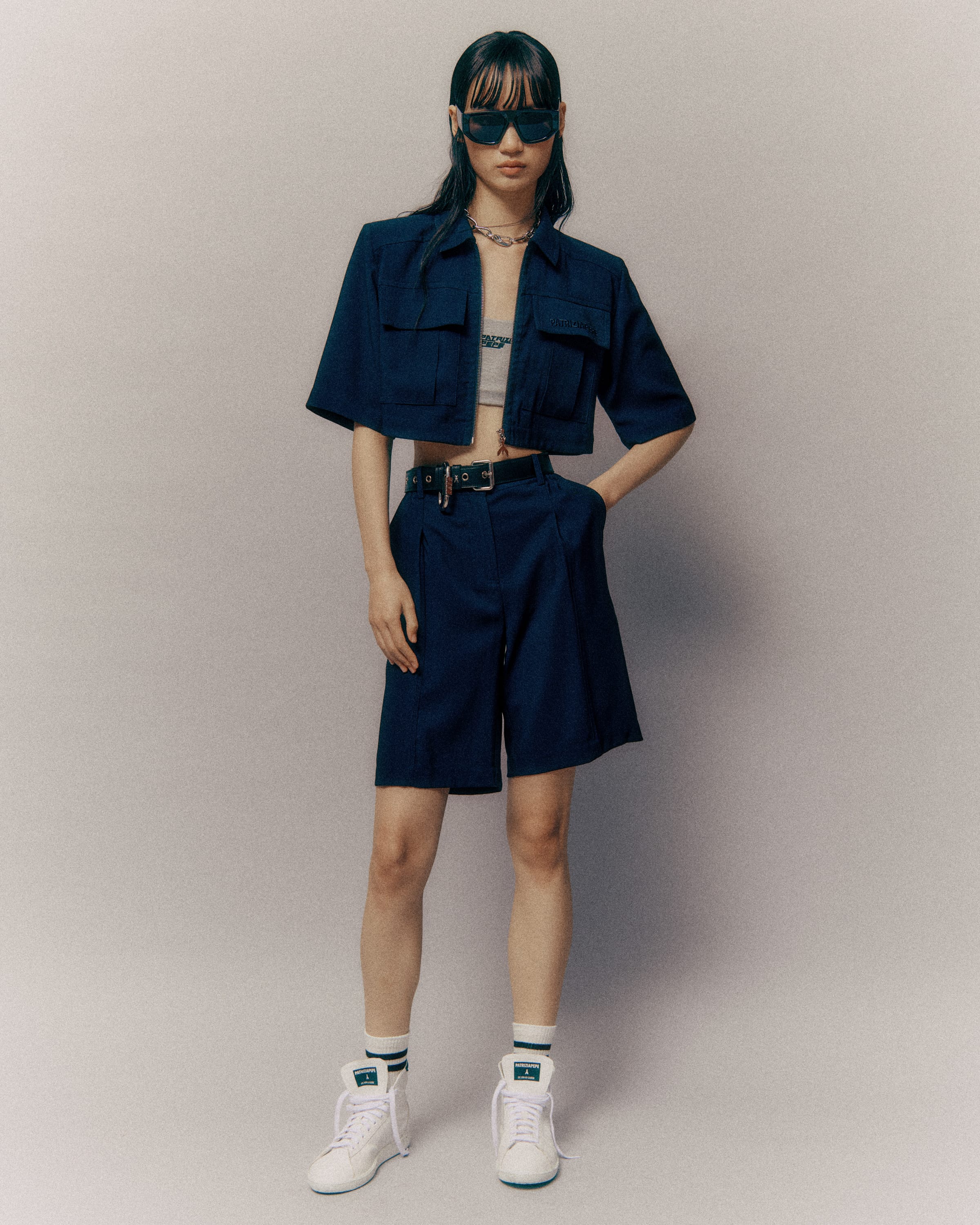 I crop top in denim delavé, le camicie mini e i boxer in cotone a righe — chiaro omaggio al classico pigiama maschile — si mescolano in un gioco di proporzioni e layering che sfugge ogni rigidità. Il denim ultraleggero diventa protagonista assoluto, raccontando un’eleganza effortless, dinamica, quasi androgina ma mai spigolosa.