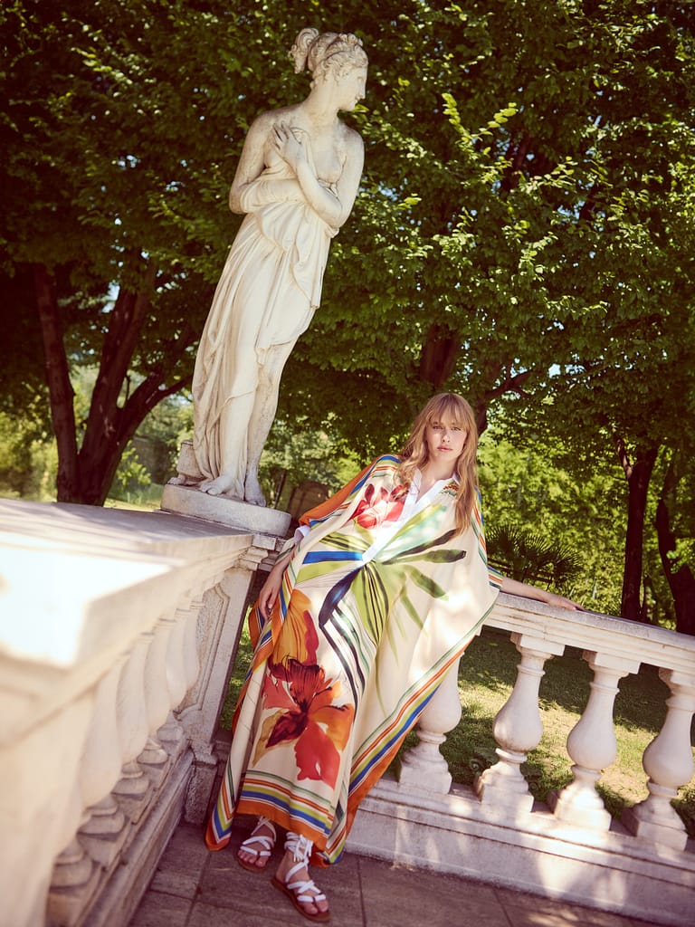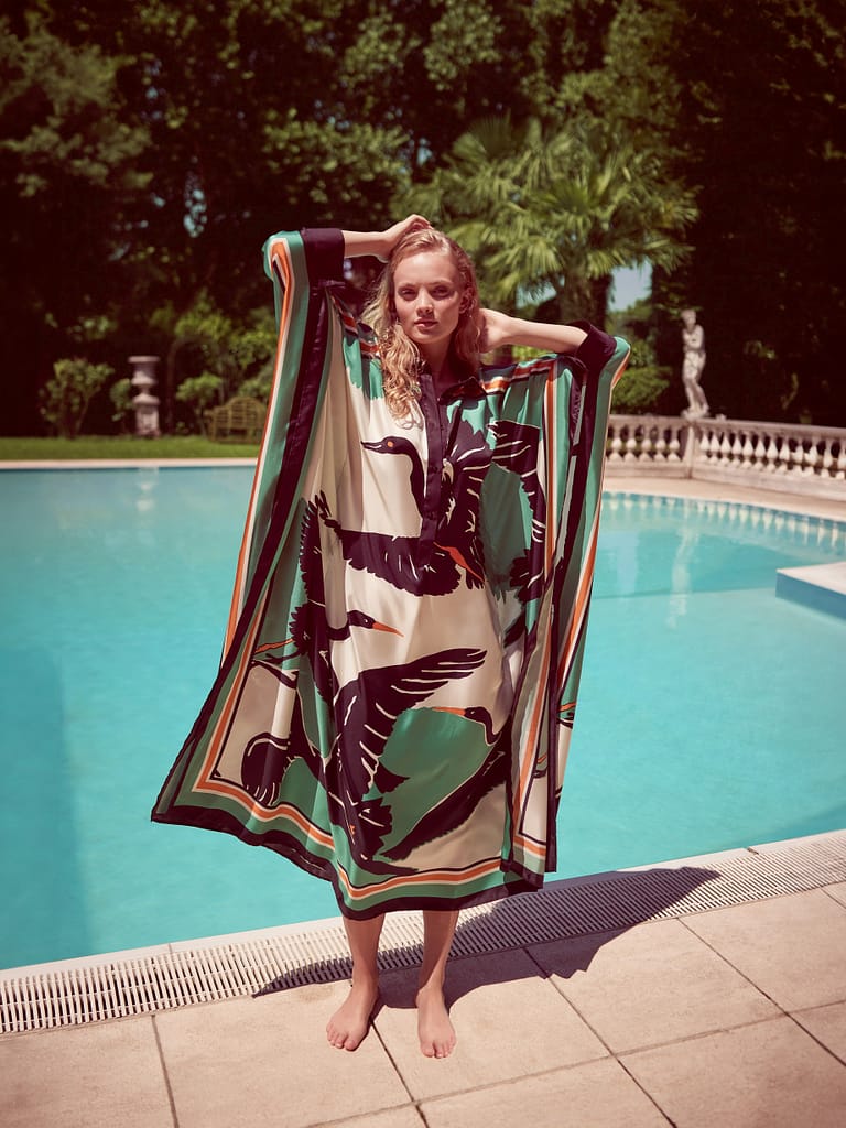 Per la Primavera-Estate 2025, Sara Roka reinterpreta il caftano con un’eleganza contemporanea, attingendo alla tradizione per dare vita a un capo che incarna lo spirito bohémien con un tocco di modernità. La sua proposta per la stagione si traduce in un caftano lungo, impreziosito da stampe ispirate all’airone e motivi floreali, in una palette che richiama il fascino delle destinazioni esotiche. Realizzato in 100% twill di seta, il design si distingue per una raffinata chiusura frontale a polo, arricchita da dettagli a contrasto in popeline di cotone, conferendo struttura e carattere a una silhouette fluida e leggera.