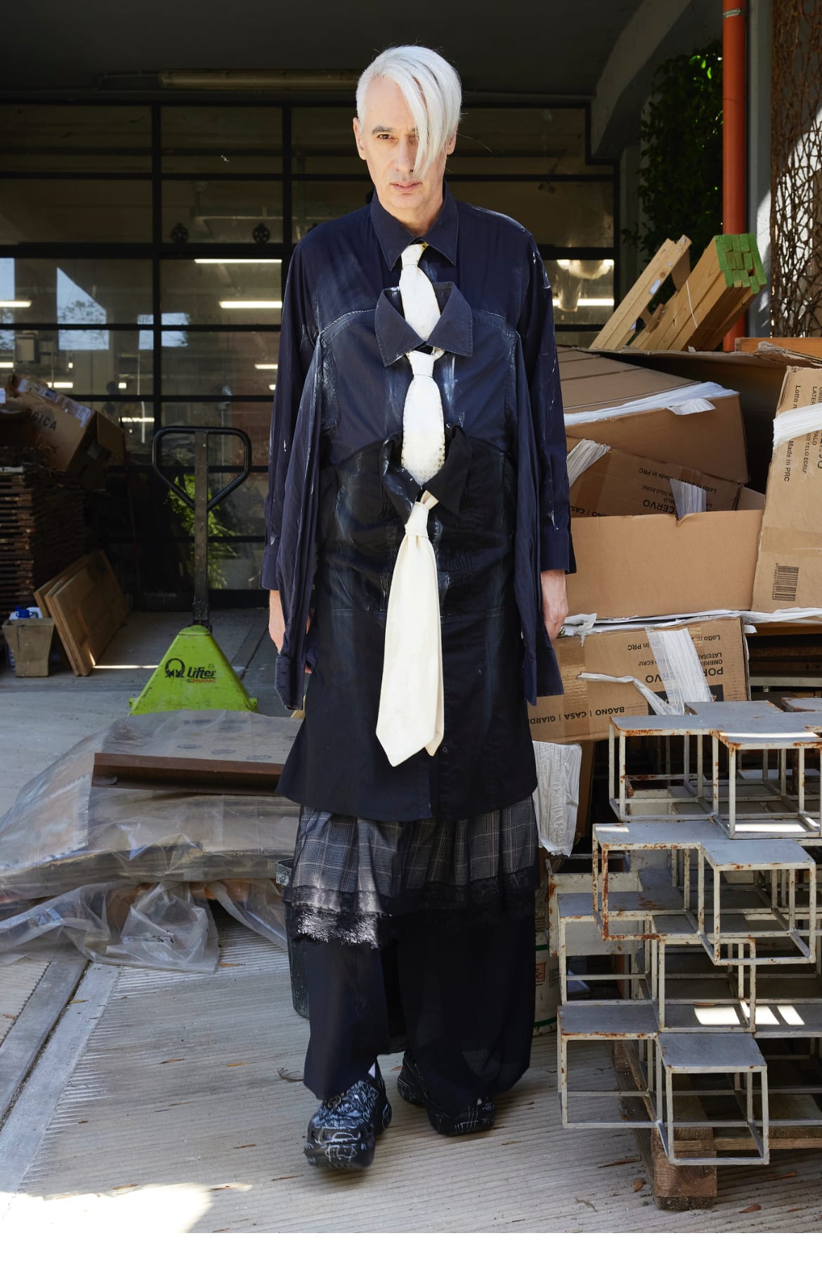 E sì, Simon Cracker lo ammette con ironia: questa collezione ha un che di Margieliano. Nel processo creativo riaffiorano suggestioni che evocano l’ultimo vero rivoluzionario della moda (Martin, l’uomo, non il marchio): dettagli fuori scala, vernici bianche, trompe-l’oeil, patine del tempo. Ma, soprattutto, quella visione di guardaroba fatto di codici riconoscibili, sempre identici eppure costantemente nuovi.